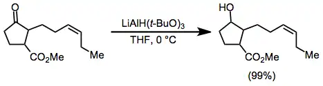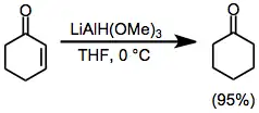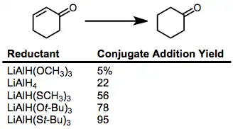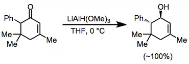 Selektivní redukce α,β-nenasycených ketonů lze provést buď jako 1,2-, nebo jako 1,4-reakce vhodně zvolenými redukčními činidly. Pomocí hydridu lithnotrimethoxyhlinitého, který je stericky nezatížen, je možné uskutečnit téměř kvantitativní přímé adice na karbonylové skupiny,[21] zatímco použití stericky zatíženého hydridu lithnotrimethoxyhlinitého vede k tvorbě produktu konjugované adice.[22]