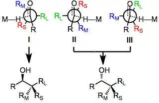 Vznik diastereoselektivity v redukcích chirálních ketonů bylo podrobně prozkoumáno a modelováno.[14][15] Podle modelu, který vyvinul H. Felkin,[16] diastereoselektivitu řídí relativní energie tří přechodných stavů I, II a III. Přechodný stav I převládá za nepřítomnosti polárních skupin na α uhlíku a stereoselektivita se zvyšuje s velikostí nechirálního ketonového substituentu (R). Přechodný stav III je hlavním u reakcí alkylketonů, kde RM je skupina odtahující elektrony, protože nukleofil a skupina odtahující elektrony mají snahu být co nejdále od sebe.