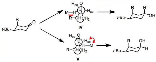Byla prozkoumána i diastereoselektivita redukcí cyklických ketonů. Ketony schopné měnit konformace podstupují axiální atak hydridu, který vede k ekvatoriálnímu alkoholu; pevné cyklické ketony ovšem převážně podléhají ekvatoriálním atakům a vytváří axiální alkoholy. Převaha ekvatoriálních ataků u těchto ketonů se vysvětluje tím, že ekvatoriální přiblížení hydridu je méně stericky stíněno než axiální.[17] Převaha axiálních ataků u konformačně volných cyklických ketonů vysvětlili svým modelem H. Felkin a N. T. Anh.[18][19] Přechodný stav u axiálního ataku (IV) je zatížen sterickým odpuzováním mezi axiálními substituenty a přibližujícím se hydridem. Přechodný stav ekvatoriálního ataku (V) se vyznačuje torzním napětím mezi hydridem a ekvatoriálními vodíky. Rozdíl energií těchto napětí určuje převládající směr ataku; u malých R je torzní napětí na V větší, což vede k přednostní tvorbě ekvatoriálního alkoholu.