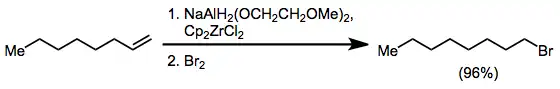 Některé alkoxyaluminiumhydridy mohou hydroaluminovat alkeny.[26] V podobné reakci vytváří bis(2-methoxyethoxy)hydridohlinitan sodný reakcí se zirkonocendichloridem hydrid zirkonocenchloridu (Schwartzovo činidlo), který je schopen hydrozirkonovat alkeny; ze vzniklých produktů lze reakcemi s elektrofily získat funkcionalizované produkty.[27]