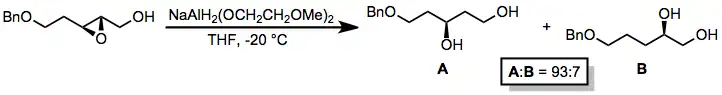 Epoxidy bývají alkoxyaluminiumhydridy atakovány na méně substituovaných místech. Pokud se v jejich blízkosti nacházejí hydroxylové skupiny, může dojít k vnitromolekulárnímu přesunu hydridu, který umožní selektivní otevření kruhu 1,2-disubstituovaného epoxidu v poloze bližší k hydroxylu.[24] Konfigurace epoxidového uhlíku nezapojeného do reakce se zachovává.