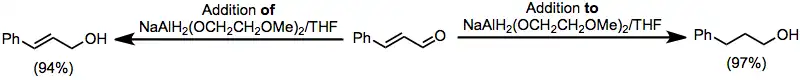 Nenasycené karbonylové sloučeniny mohou být redukovány jak na nenasycené, tak i na nasycené alkoholy. Adicemi bis(2-methoxyethoxy)hydridohlinitanu sodného na nenasycené aldehydy se tvoří nenasycené alkoholy; opačnou adicí vznikne nasycený alkohol.[25]