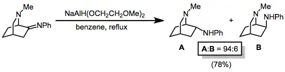 Iminy jsou alkoxyaluminiumhydridy redukovány na aminy. V níže uvedeném případu se vytváří exo-amin s vysokou diastereoselektivitou. Selektivita redukce hydridem je zde vyšší, než u katalytické hydrogenace.[30]