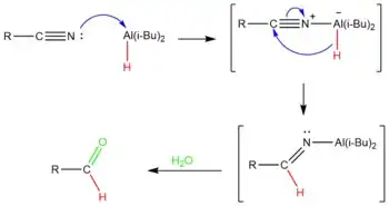 Diisobutylaluminiumhydrid se při částečných redukcích nitrilů používá za nízkých teplot.[14] Atom hliníku zde funguje jako Lewisova kyselina, která přijímá elektronový pár poskytnutý nitrilem. Nitril je následně redukován přesunem hydridového iontu na uhlík trojné vazby C-N, čímž se vytvoří imin. Po přidání vody se komplex hliníku hydrolyzuje na aldehyd.[15] Protože hydrolýza vytvářející aldehyd probíhá na konci procesu, tak nedochází k přeredukování.
