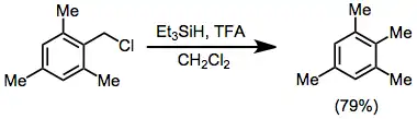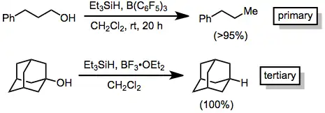 Některé alkoholy lze redukovat na alkany reakcemi s hydrosilany za přítomnosti silných Lewisových nebo Brønstedových kyselin. V redukcích terciárních alkoholů je obvykle redukčním činidlem etherát fluoridu boritého.[2] Primární alkoholy vyžadují nadbytek silanu, silnější Lewisovy kyseliny a delší reakční doby.[3]