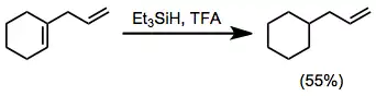 Hydrosilany mohou redukovat 1,1-disubstituované vazby, které vytvářejí protonací stabilní terciární karbokationty. Trisubstituované dvojné vazby lze redukovat selektivně, pokud jsou přítomny 1,2-disubstituované a nebo monosubstituované alkeny.[15]