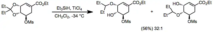 Acetaly, ketaly a aminaly se také dají redukovat hydrosilany s kyselinami. Regioselektivní redukce acetalu s neekvivalentními kyslíky byla například zahrnuta do syntézy oseltamiviru (Tamiflu).[18]