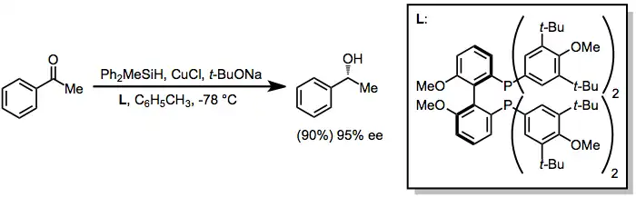 - ↑ Bruce H. Lipshutz; Kevin Noson; Will Chrisman; Asher Lower. Asymmetric Hydrosilylation of Aryl Ketones Catalyzed by Copper Hydride Complexed by Nonracemic Biphenyl Bis - phosphine Ligands. Journal of the American Chemical Society. 2003, s. 8779–8789. doi:10.1021/ja021391f. PMID 12862472.