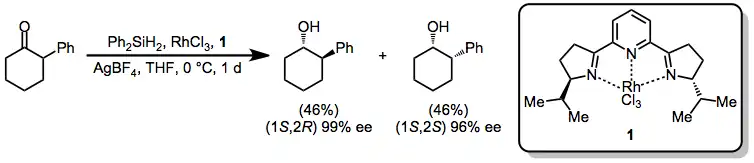 Fenylcyklohexanon se redukuje za přítomnosti rhodiového katalyzátoru 1 a chloridu rhoditého, přičemž reakce není diastereoselektivní, ale má vysokou enantioselektivitu.[13]
