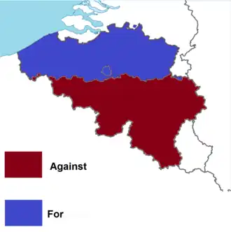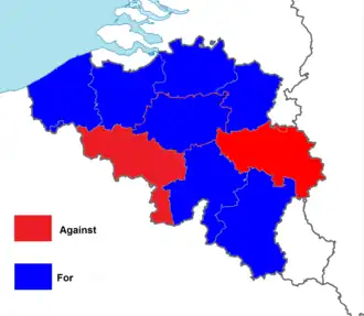 | Valonsko (čtyři valonské provincie plus Nivelles)[4] | 1 844 337 | 51 318 | 755 044 | 42,1 | 1 037 975 | 57,9 | |