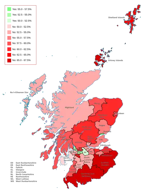 - Pro nezávislost hlasovaly 4 ze 32 správních oblastí: Západní Dunbartonshire, Glasgow, Severní Lanarkshire a Dundee. Ostatní hlasovaly proti nezávislosti.[2]