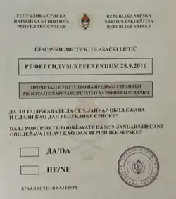 Referendum se v Republice srbské uskutečnilo 25. září 2016. Voliči z poloviny území Bosny a Hercegoviny hlasovali o tom, má li se stát den 9. leden (den vyhlášení Republiky srbské) národním dnem pro uvedenou entitu v Bosně. Referendum se uskutečnilo v atmosféře politické nevraživosti mezi politickými zástupci Federace Bosny a Hercegoviny a Republiky srbské; Ústavní soud Bosny a Hercegoviny prohlásil dne 25. listopadu 2015 existenci takového svátku za neústavní. V referendu hlasovalo celkem 55,77 % oprávněných voličů a 99,8 % jejich hlasů schválilo vznik nového svátku.