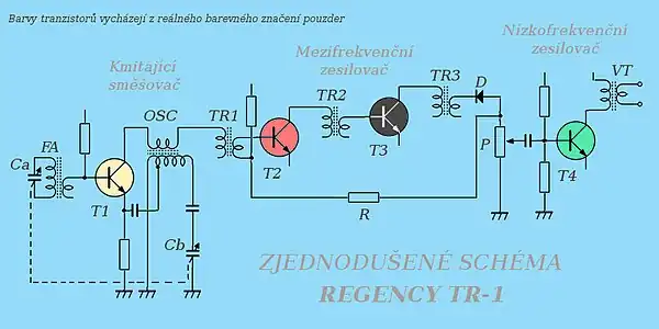Přijímač je řešen jako superheterodyn. Na vstupu přijímače se nachází feritová anténa. Oproti původnímu prototypu přijímače, navrženému společností Texas Instruments, byly ve finální verzi Regency TR-1 použity jen čtyři tranzistory. Varianta pocházející od Texas Instruments měla samostatný směsovač a samostatný oscilátor. Inženýr společnosti IDEA Richard C. Koch jeden tranzistor ušetřil, protože použil kmitající směšovač (tranzistor T1 na obrázku). Vstupní a oscilátorový obvod jsou přelaďovány dvojitým ladicím kondenzátorem (na obrázku mají sekce kondenzátoru označení Ca, resp. Cb).