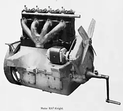 Firma RAF na podnět svého konstruktéra J. Lavioletta v roce 1912 uzavřela smlouvu s firmou Daimler Co. Ltd. v Coventry o licenční výrobě bezventilových šoupátkových motorů Knight. V rozvodovém systému čtyřdobého pístového motoru není řízena doba sání a výfuku ventily, ale plášťovými šoupátky. Tento systém a motor vynalezl Američan Charles Yale Knight. V roce 1908 si jej dal patentovat ve Velké Británii a licenci na jeho výrobu pak zakoupily automobilky Daimler, Minerva, Panhard & Levassor, Itala, Benz a další. V jednotlivých státech mohla vlastnit licenci pouze jedna firma. V Rakousku-Uhersku se touto firmou stala liberecká automobilka. RAF potom vyráběla kvalitní, tiché a pružné, ale technologicky mimořádně náročné motory se dvěma dvojicemi válců, klikovým hřídelem uloženým v pěti dělených ložiscích, s tlakovým oběhovým mazáním a s nuceným oběhem chladicí kapaliny.[7] RAF nabízel od roku 1913 čtyři typy automobilů s motory Knight (modely RAF-Knight 30/35 HP, RAF-Knight 10/30 HP, RAF-Knight 13/40 HP a RAF-Knight 18/50 HP).[1] Motory Knight se také dodávaly v rámci Rakouska-Uherska firmě Puch v Grazu, ale spolupráce s touto firmou se neprojevila jako efektivní.[6]