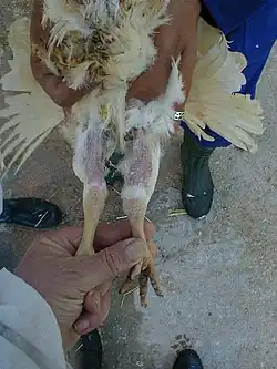 Vznik onemocnění je pomalý, průběh většinou chronický; časté jsou subklinické infekce. Klinicky zjevné onemocnění pohybového aparátu se objevuje nejčastější u brojlerů ve věku 4-7 týdnů a u krůt ve věku 5-8 týdnů. Kuřata i krůťata se nerada pohybují, posedávají, při vynuceném pohybu kulhají, nadlehčují postiženou končetinu nebo se pohybují po oteklých a deformovaných hleznových kloubech. Jejich výživný stav je dobrý, ale zaostávají v růstu. U starších chovných kohoutů je někdy pozorována ruptura šlachy dvouhlavého lýtkového svalu (m. gastrocnemius), což se projevuje kolébavým krokem, nepohyblivostí (ankylózou) kloubu i končetiny a někdy i rupturou šlach ohybačů a natahovačů prstů.