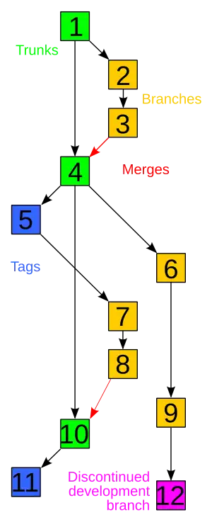 Novější verzovací systémy (kupř. systém git) umožňují, aby každý soubor byl aktuální ve více podobách, tzv. větvích (anglicky branches), současně. Větev je potom vlastností (parametrem) každé operace commit.
