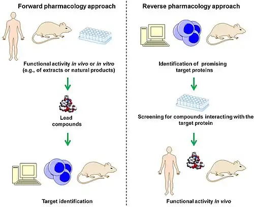 V oblasti objevování léčiv, se při reverzní farmakologii,[1][2][3] známé také jako objevování léčiv na základě cíle (target-based drug discovery; TDD),[4] nejprve vysloví hypotéza, že modulace aktivity určitého (proteinového) cíle, o němž se předpokládá, že má vliv na vznik a/nebo průběh onemocnění, bude mít příznivé terapeutické účinky. Poté se pomocí screeningu chemických knihoven malých molekul identifikují sloučeniny, které se k cíli vážou s vysokou afinitou. Hity z těchto screeningů (tj. slibné molekuly mající požadovaný efekt) se pak použijí jako výchozí body pro objevování léčiv. Tato metoda se stala populární po sekvenování lidského genomu, které umožnilo rychlé klonování a syntézu velkého množství purifikovaných proteinů. Tato metoda je dnes při objevování léčiv nejrozšířenější.[5] Na rozdíl od klasické farmakologie (dopředné; "forward pharmacology") se u přístupu reverzní farmakologie v závěrečných fázích objevování léčiv obvykle provádí účinnost in vivo identifikovaných aktivních sloučenin ("lead compounds").