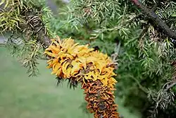 Na jalovcích se tvoří zduřeniny až znetvořeniny větviček, někdy i silnějších větví. Během vegetace zasychají a tvoří se strupy a rány, které mohou být napadány dalšími patogeny. Poškozen je růst a vedení asimilátů. U silněji napadených výhonů odumírají části nad poškozením. Rostliny zakrňují. Silněji napadené, jinak oslabené a staré rostliny mohou uhynout. V místech v okolí napadení, tam kde jsou pletiva poškozena, v zimním období snadněji dochází k poškození celých větví vahou sněhu, lámání.
