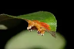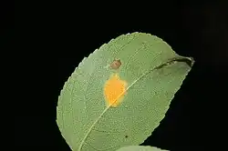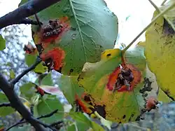 Na povrchu listů hrušní jsou viditelné oranžové až červené oválné skvrny o průměru několika mm. Uprostřed skvrn jsou viditelné černé tečky, spermogonie. Na spodní straně se později tvoří pohárkovité světlehnědé aecidie.[1] Při silnějším výskytu může být poškozeno až 80% listové plochy u hrušně.[L 1] Jiné zdroje uvádí hranici 30%.[2] Následně je ovlivněna asimilace, vyzrávání pletiv a vývoj plodů. Na plodech hrušní se vyskytují deformace. Aecidie vyrůstají i na plodech.