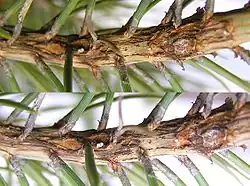 - ↑ a b Melampsora pinitorqua na www.forst.tu-muenchen.de. www.forst.tu-muenchen.de [online]. [cit. 2013-04-09]. Dostupné v archivu pořízeném dne 2011-11-11.