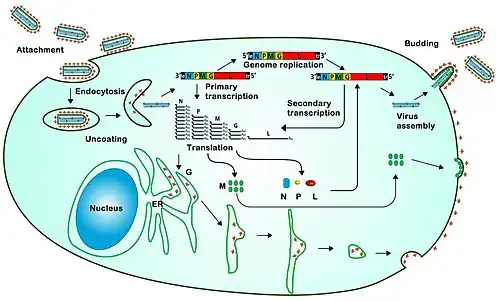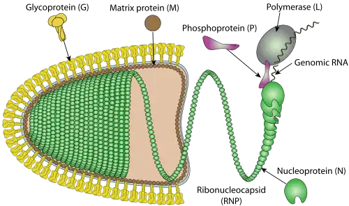 Samotnou infekční částí viru je tzv. ribonukleoproteinový komplex tvořený RNA, N proteiny a polymerázovým komplexem z L a P proteinů. Ten je schopen zajistit jak transkripci, tak replikaci virového genomu bez pomoci dalších buněčných proteinů, ačkoli aktivaci a regulaci mohou napomáhat některé buněčné kinázy. RNA je v cytoplazmě stále obalena N proteiny, které ji chrání před buněčnými nukleázami, ale i vnitrobuněčnými receptory vrozené imunitní odpovědi. Komplex RNA a N proteinů, nikoli „holá“ RNA, také pro virovou polymerázu slouží jako templát.[12]