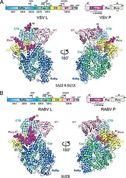 - ↑ a b c IVANOV, Ivan; YABUKARSKI, Filip; RUIGROK, Rob W. H. Structural insights into the rhabdovirus transcription/replication complex. Virus Research. 2011-12-01, roč. 162, čís. 1–2, s. 126–137. Dostupné online [cit. 2024-11-03]. ISSN 0168-1702. doi:10.1016/j.virusres.2011.09.025.