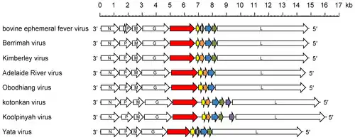 - ↑ a b LONGDON, Ben; MURRAY, Gemma G. R.; PALMER, William J. The evolution, diversity, and host associations of rhabdoviruses. Virus Evolution. 2015, roč. 1, čís. 1. Dostupné online [cit. 2024-10-30]. ISSN 2057-1577. doi:10.1093/ve/vev014. PMID 27774286. (anglicky)