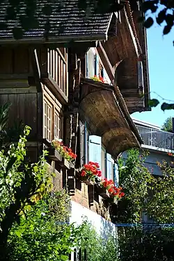 - Štítové stříšky vznikly v 16. století v kantonu Schwyz ve Švýcarsku. Chrání před srážkami, v létě zastíní okna při silném slunečním svitu[5] a staly se také typickým znakem domů ve stylu Rheintalhaus.[6][8] Původně byly stříšky velmi jednoduché s odkrytou podhledovou stranou, později začala být podhledová strana těchto stříšek stavěna jako konkávní (vydutá) a bohatě zdobená.[5]