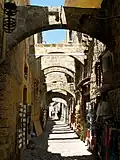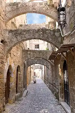 V roce 1522 dobyli osmanští Turci po dlouhém obléhání město Rhodos. Vystavěli zde nové budovy: mešity, veřejné lázně a sídla pro novou elitu. Řekové byli přinuceni opustit opevněné město a usadit se v nových čtvrtích za hradbami. Za osmanské éry město pozbylo svůj mezinárodní charakter, zachovalo si však svoji hlavní ekonomickou funkci tržiště pro zemědělské výrobky z vnitrozemí ostrova a okolních menších ostrovů. Po upevnění své nadvlády nad ostrovem přeměnili Turci většinu kostelů na mešity a z velkých domů učinili soukromá sídla nebo veřejné budovy. Jednalo se o dlouhodobý proces, jehož cílem bylo přizpůsobit je osmanskému způsobu života. Zdobená průčelí domů z rytířského období, klenuté brány a zdi z přitesaných kamenů byly obohaceny prvky osmanské architektury přizpůsobené zdejšímu podnebí a kultuře. Při tomto procesu zůstala většina architektonických rysů stávajících budov zachována. Nejtypičtějšími přírůstky byly lázně (obvykle v zadní části domů) a uzavřené dřevěné balkony vystupující z průčelí do úzkých uliček.[5]