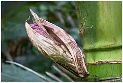 Květenství, nazývané kvůli své silné ose palice, je dlouhé 20 až 40 cm a mnohonásobně rozvětvené, před rozvitím je těsně sbaleno v hladkém toulci velkém 30 × 15 cm, který s otevřením prvních květů usychá a padá na zem. Květenství je větveno do třech řádů, má asi čtyřicet větví a z nich se některé dělí opět na čtyři či pět větévek. Jednopohlavné, pevně přisedlé květy mají světle fialové či růžové trvalé okvětí. Každá konečná větvička nese četné květy seskupené do triád, v nichž je vytrvalý samičí květ mezi dvěma opadavými květy samčím. Pouze na konci každé větvičky vyrůstají v délce 5 až 7 cm jen samčí květy, střední samičí mezi nimi chybí. Květy mají tři úzké, poněkud kýlovité kališní lístky a tři prohnuté, špičaté korunní lístky o málo delší, listeny květů jsou na bázi široké a ke špičce se zužují.