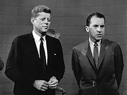 V roce 1960 zahájil Nixon svou první kampaň na prezidenta Spojených států, oficiálně ji oznámil 9. ledna 1960. Zvítězil v primárkách a za svého kandidáta na viceprezidenta si zvolil amerického velvyslance v OSN Henryho Cabota Lodge Jr. Jeho soupeřem byl demokrat John F. Kennedy, přičemž průzkumy byly dlouho vyrovnané. Nicméně novinkou voleb byly televizní prezidentské debaty. V první ze čtyř takových debat se Nixon jevil bledý a unavený, na rozdíl od fotogenického Kennedyho. Nixonův výkon v debatě byl ve vizuálním médiu televize vnímán jako průměrný, ačkoli mnoho lidí poslouchajících v rádiu si myslelo, že Nixon debatu vyhrál. Ve volbách Nixon těsně prohrál. V Texasu a Illinois, v obou státech, kde vyhrál Kennedy, byla vznesena obvinění z volebních podvodů. Nixon odmítl uvažovat o zpochybnění výsledku voleb, protože se domníval, že zdlouhavá kontroverze by oslabila Spojené státy v očích světa a že nejistota by poškodila americké zájmy.[16]