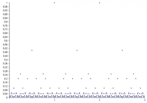 - Nabývá ostrého lokálního maxima v každém racionálním bodě a neostrého globálního minima v každém iracionálním bodě.