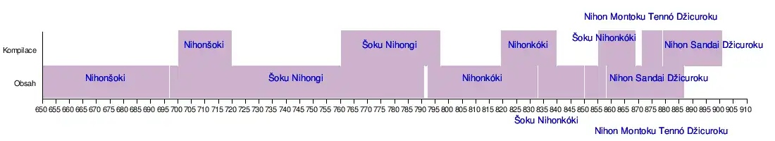 - Šoku Nihongi (Pokračování Kroniky Japonska, zvané rovněž Šokki) – 40 svazků, jež pokrývají období let 697 až 791. Dokončili ji dvořané Cugutada Fudžiwara a Mamiči Sugano v roce 797.