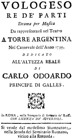 - Vologeso, re de' Parti, dramma per musica (Guido Eustachio Luccarelli, 1739 Řím, Teatro Argentina)