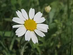 Na koncích větví vyrůstají stopkaté květní úbory s prodlouženým, kuželovitým květním lůžkem porostlým špičatými plevkami. Úbor má v průměru 2 až 3 cm, jeho polokulovitý, víceřadý zákrov je složen z podlouhlých, střechovitě uspořádaných, bledých a na špičce hnědě mázdřitě lemovaných listenů. V terči úboru jsou oboupohlavné květy s pěti tyčinkami, pěticípou trubkovitou korunou zlatožluté barvy a dvouplodolistovým pestíkem. Po okraji terče vyrůstá osm až patnáct jazykovitých samičích květů s bílými, opadavými, eliptickými ligulami dlouhými 5 až 17 mm, které mají na hrotu dva až tři zoubky. Rostliny kvetou od konce května do podzimu, květy jsou opylovány drobným hmyzem.