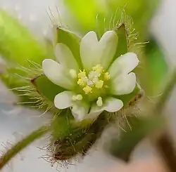 Květy na vzpřímených nebo do boku odstávajících stopkách (několikráte delších než kalich) vytvářejí v počtech 3 až 50 vidlanovitá květenství s dlouhými ochlupenými větvemi. Jejich oboustranně chlupaté listeny jsou bylinné, nemají bělavý blanitý lem a tvarem se podobající menším listům lodyžním. Pět kopinatých kališních lístků 3 až 6 mm dlouhých s blanitým lemem bývá na vrcholech zakončeno ostře nebo tupě a jsou na vnější straně hustě porostlé až 2 mm dlouhými chlupy přesahujícími vrchol kalichu. Vejčitých až kopinatých, u báze brvitých, bíle zbarvených korunních lístků kratších než kališní je také pět. Bývají dlouhé jen 2 až 3 mm a jsou hluboce dvoulaločné (zářez sahá průměrně do třetiny jejich délky). Tyčinek s brvitými nitkami nesoucími chlupaté prašníky je v květu deset, čnělek je pět.