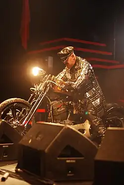 Jeho oblíbeným kouskem je příjezd na pódium motorkou Harley-Davidson.