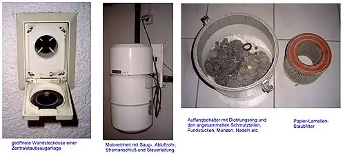 Hlavní částí celého systému centrálního vysavače je sací jednotka s odlučovačem prachu, která je umístěna v suterénu domu, garáži, ve skladu nebo jiné technické místnosti. K sacímu vstupu centrálního vysavače - jednotky je připojen potrubní systém, který je důmyslně rozveden tak, aby bylo vysávání pohodlné. Potrubní systém je ukončen ve speciálních zásuvkách, jejichž počet a umístění se vždy řídí dispozičním řešením dané nemovitosti (z jedné zásuvky se doporučuje vysávat maximálně 65 m²). Je nutno podotknout, že na jednotce centrálního vysavače je i výfukové potrubí, kterým se odvádí přefiltrovaný vzduch ven z budovy. V praxi to znamená, že pomocí hadice centrálního vysavače vysáváte prach a jiné nečistoty, které jdou přes potrubní systém do centrálního vysavače - jednotky, v jednotce se nečistoty a prach odloučí díky cyklónovému efektu a přes speciální filtr (filtr vyžaduje minimální údržbu a jeho životnost dosahuje až pěti let) odchází přefiltrovaný vzduch mimo vysávaný objekt. Díky této účinnosti klesá výrazně prašnost ve vysávaném objektu proto, že se zpátky nedostává přefiltrovaný vzduch a nerozviřuje prach tak, jak je tomu u klasických vysavačů.