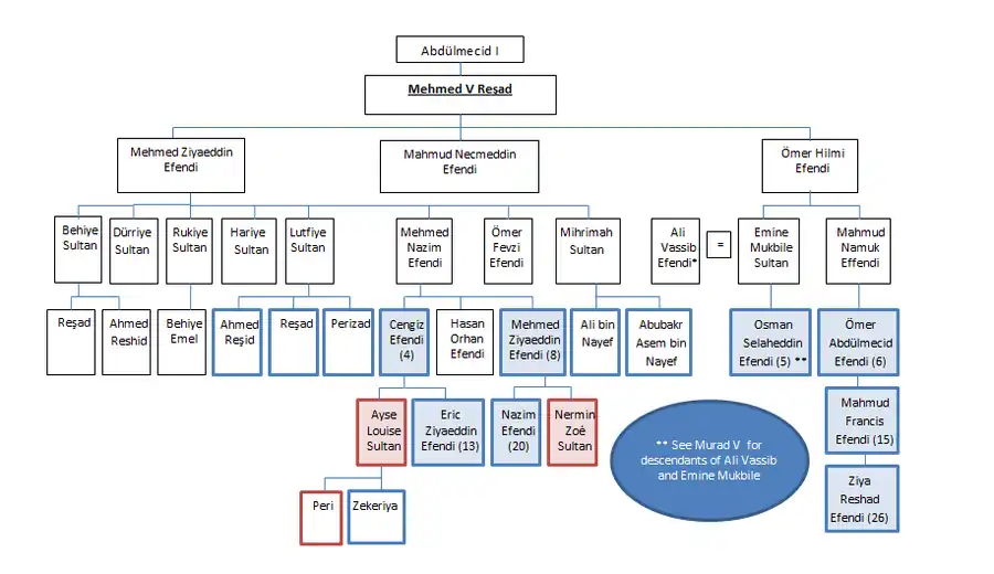 Formálně se mužští potomci osmanských sultánů oslovovali Devletlû Najabatlu Şehzade Sultan (křestní jméno) Hazretleri Efendi. Podle genealogie Osmanské dynastie a kdyby nepadl sultanát, by bylo 29 princů z linie Bayezida Osmana, pozdější hlavy rodiny. Nástupnické právo pak bylo určováno podle prvorozenosti, tedy na trůn nastupoval nejstarší muž dynastie.