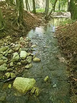 Pramení v Malých Karpatech, v podcelku Pezinské Karpaty, v části Biele hory, na severním svahu Horného vrchu (643,1 m n. m.) v nadmořské výšce kolem 425 m n. m.
