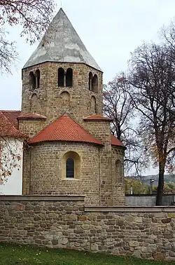 Římsový obloučkový vlys apsidy kostela Velehradského kláštera (před 1228) -