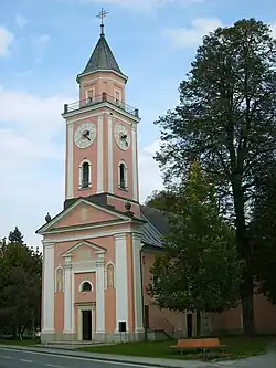 ![]() Rosegg/Rožek, farní kostel sv. Michaela, celkový pohled na obec od severu | |