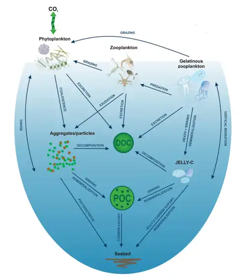 - ↑ a b c LEBRATO, Mario; PAHLOW, Markus; FROST, Jessica R. Sinking of Gelatinous Zooplankton Biomass Increases Deep Carbon Transfer Efficiency Globally. Global Biogeochemical Cycles. 2019-12, roč. 33, čís. 12, s. 1764–1783. Dostupné online [cit. 2025-07-29]. ISSN 0886-6236. doi:10.1029/2019GB006265. (anglicky)