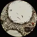 Aktinenchym sítiny (Juncus sp.) - Aerenchym – oválné buňky, s mezibuněčnými prostory, které jsou vyplněné vzduchem (častá adaptace u vodních rostlin)
