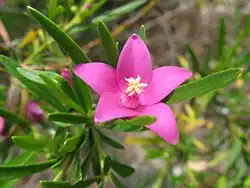 Kvetoucí Crowea; na listech jsou při detailním pohledu patrné droboučké světlé tečky – siličné nádržky