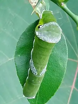 Housenka otakárka Papilio polytes na listu citrusu, na kterém jsou jako drobné světlé tečky patrné siličné nádržky