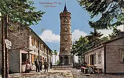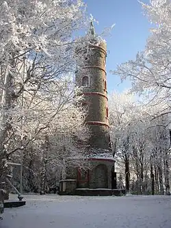 Na jaře roku 1891 vyrostla na podstavě čtyřstupňová válcová věž s vyhlídkovou plošinou ve výšce 23 metrů.[2] Nad ochozem ozdobeným cimbuřím je několik metrů vysoká věž, která zakrývá vyústění schodiště se 125 stupni. Výstavba věže stála 5 200 zlatých a rok práce.