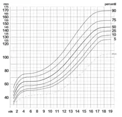 Průměrná délka nataženého penisu po narození se uvádí okolo 4 cm (1,6 palce), přičemž délka penisu u 90 % novorozených chlapců je uváděna mezi 2,4 a 5,5 cm (0,94 a 2,12 palce). Penis v omezené míře roste od narození do 5 let věku, ale jen velice málo mezi 5. rokem a počátkem puberty. Průměrná velikost na začátku puberty je 6 cm (2,4 palce) a dospělé velikosti bývá dosaženo cca o 5 let později.[zdroj?] W. A. Schonfeld v roce 1943 publikoval graf růstu penisu.