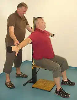 - Výzkumný tým z Fakulty sportovních studií Masarykovy univerzity sestrojil vlastní přenosné měřící zařízení (viz obrázek), které se kromě měření rozpětí paží využívá i pro měření tělesné výšky a výšky v sedě. Toto zařízení bylo využito při realizaci výzkumu úrovně pohybové aktivity české populace v letech 2011 až 2013.[5] Měření rozpětí paží na tomto zařízení probíhá následujícím způsobem: měřená osoba sedí na sedátku, které je součástí tohoto zařízení, a rukama odtlačí od sebe zarážky na koncích horizontální části zařízení, jehož kostra (včetně horizontální části opatřené měřícím pásmem) je umístěna za zády testované osoby.