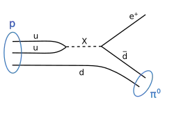 Při reakci přes boson X vzniká tento boson ze dvou kvarků u a přeměňuje se na antikvark vázaný ve výsledném pionu a na pozitron . Při reakci přes boson Y vzniká tento boson z kvarku u a kvarku d a přeměňuje se na antikvark vázaný ve výsledném pionu a na pozitron .